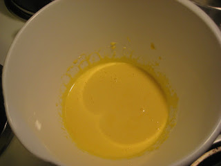 Look at how pretty and lemon-colored my yolks and sugar are! And then, I combined them with the cream in the saucepan. I think this is another place I went wrong. "Hot" is a pretty subjective term. The cream was "hot," but I think it should have been hotter. My next cream recipe put it well - not boiling, but just starting to bubble at the edges.