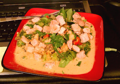 The original recipe calls for spinach to be added next and then the whole thing cooked just until the spinach is wilted. Since I just read up on enzymes (yeah, that's right, Caleb. I know about enzymes now), I waited until the cream had just started to boil, then I served up the veggies on a plate and sprinkled on the spinach. I wanted it to get a little wilty, but not so hot that it denatured the enzymes. Then top with the tuna and voila! Beautiful, tasty dinner. I apologize for the crappy cell phone photo.